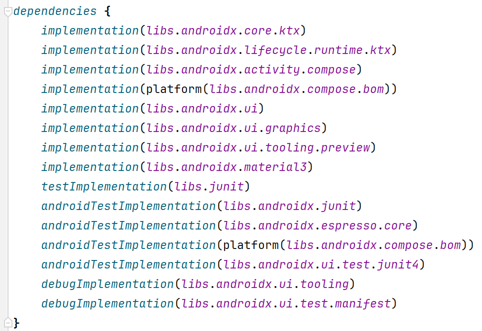 - alias(libs.plugins.android.application): android.application 플러그인을 모듈에 적용합니다. 이 플러그인은 안드로이드 앱 개발에 필요한 기본적인 설정을 제공합니다.