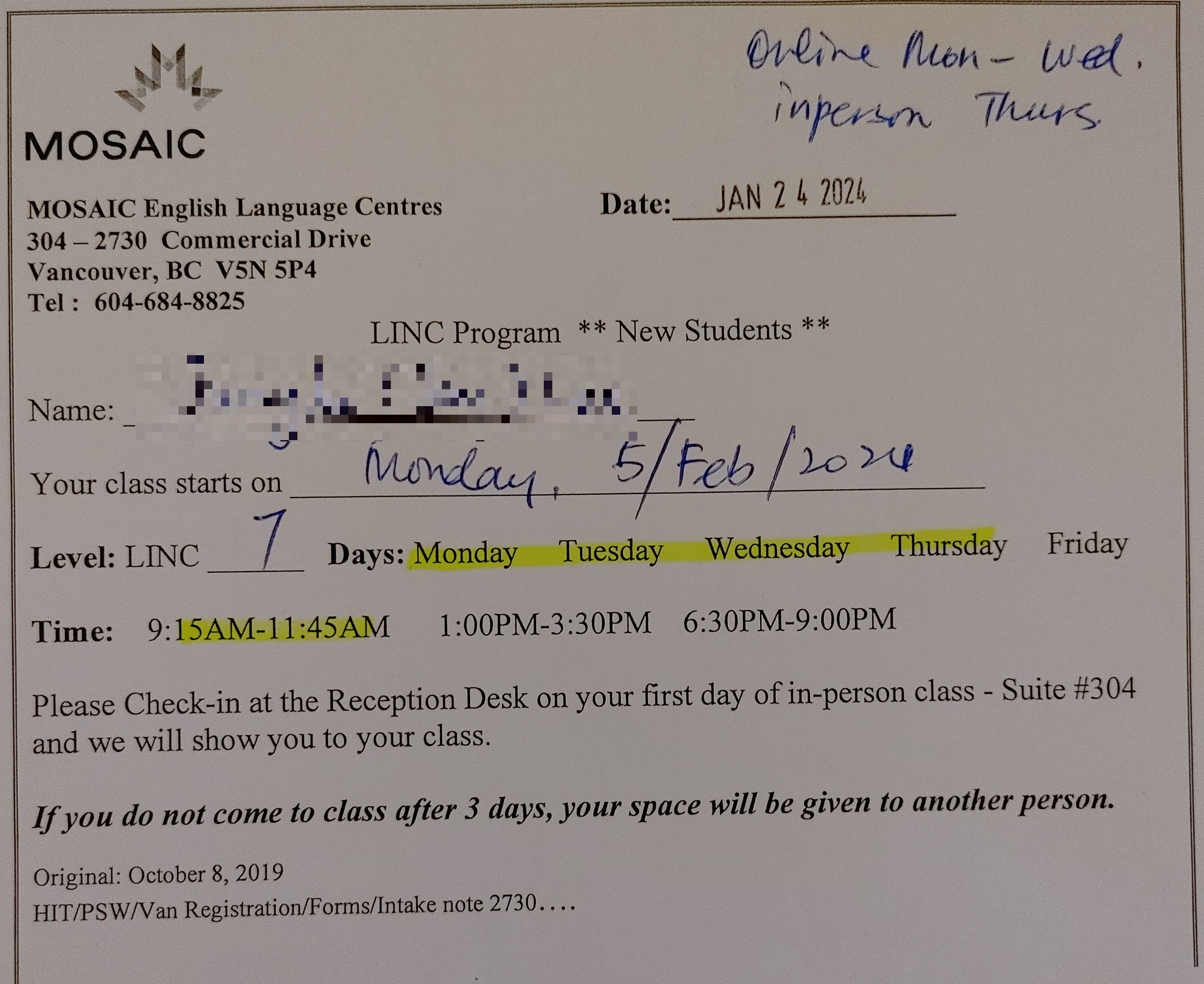 드디어 MOSAIC English Class 등록을 완료했다.