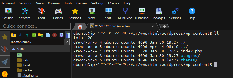 아래에서 보듯이 wp-content 폴더의 소유자와 소유 그룹의 이름은 ubuntu로 되어 있습니다.