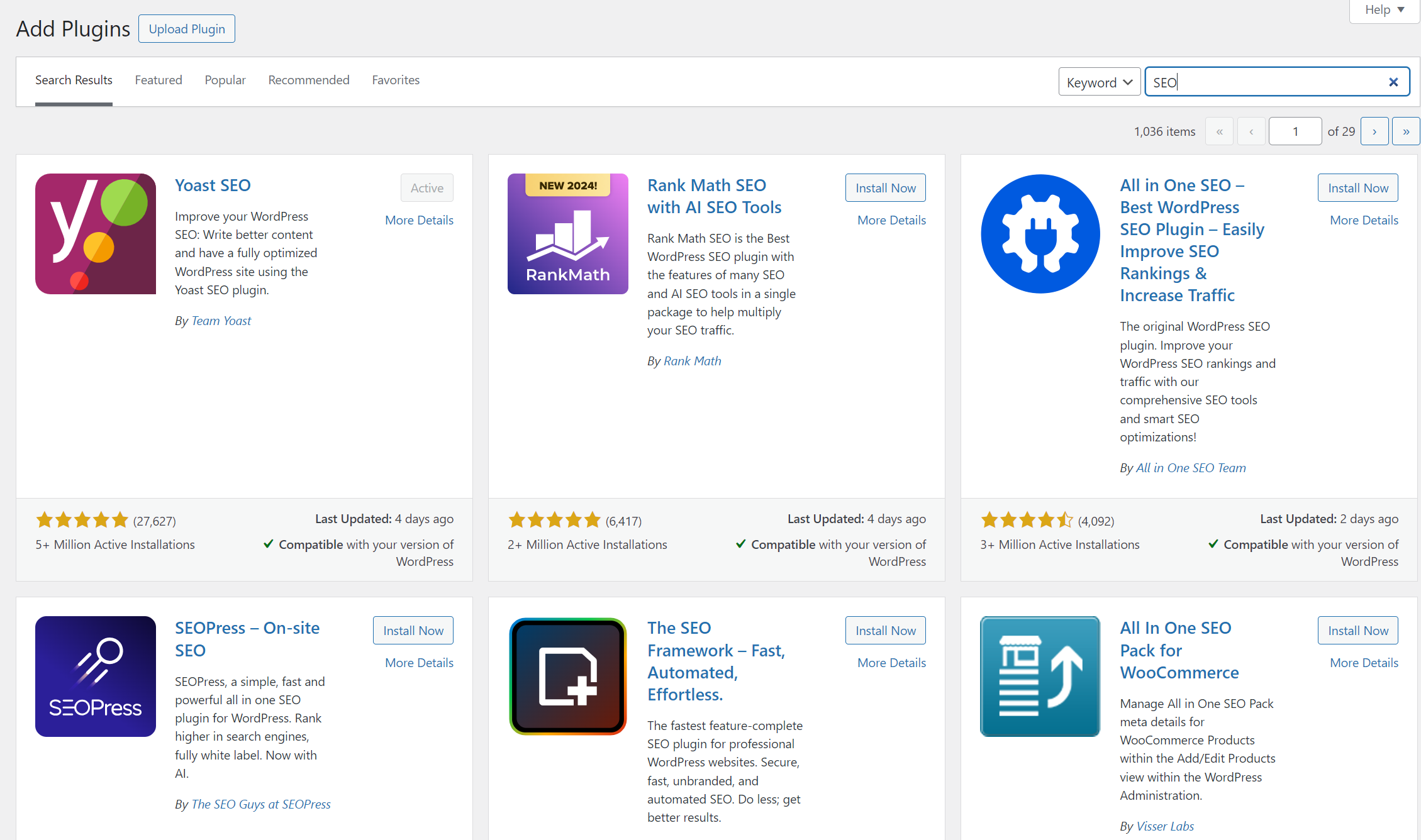 그러면 Yoast SEO가 제일 먼저 위치하게 됩니다. 저는 이미 설치가 되어 있어서 Active로 되어 있지만, 설치가 안되어 있으신 분은 Install Now로 설치한 후에 Active를 하면 됩니다.
